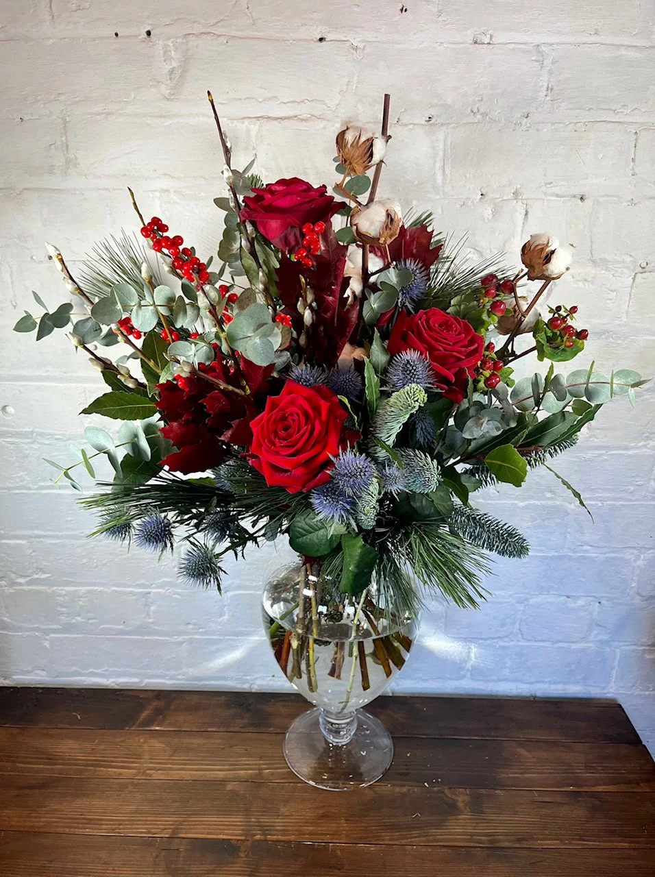 Wonderland: Frosty & magical, featuring blue sea holly, snowy cotton flower, frosty cones and sparkly baubles or bells.