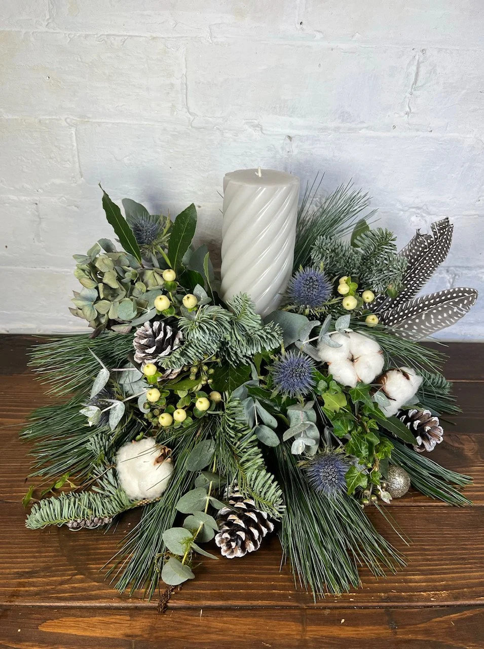 All designs are available without the candle if desired (We will substitute with more festive foliage and decoration).