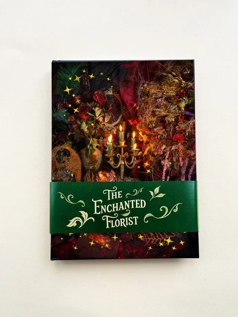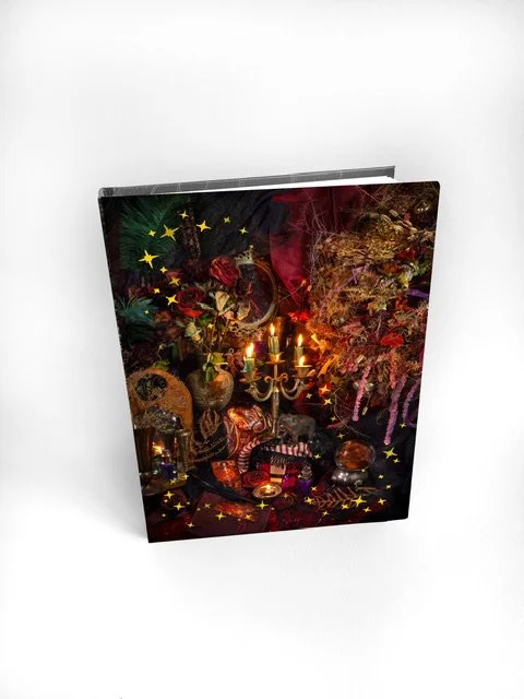 This A5, hardback diary features a shadowed fortune teller’s table lit by wavering candlelight and draped in deep crimson velvet, lace & an eclectic display of vintage curiosities.