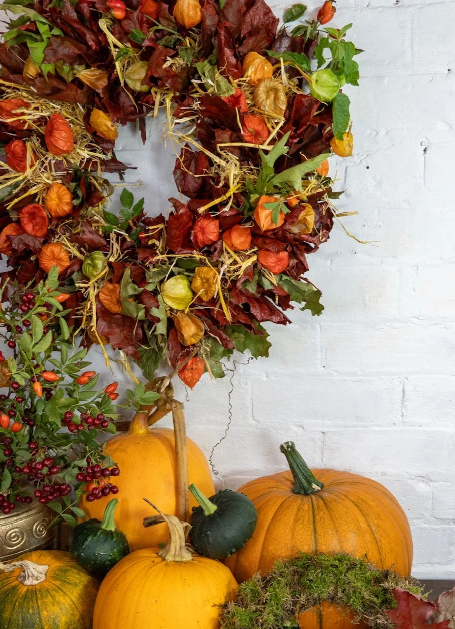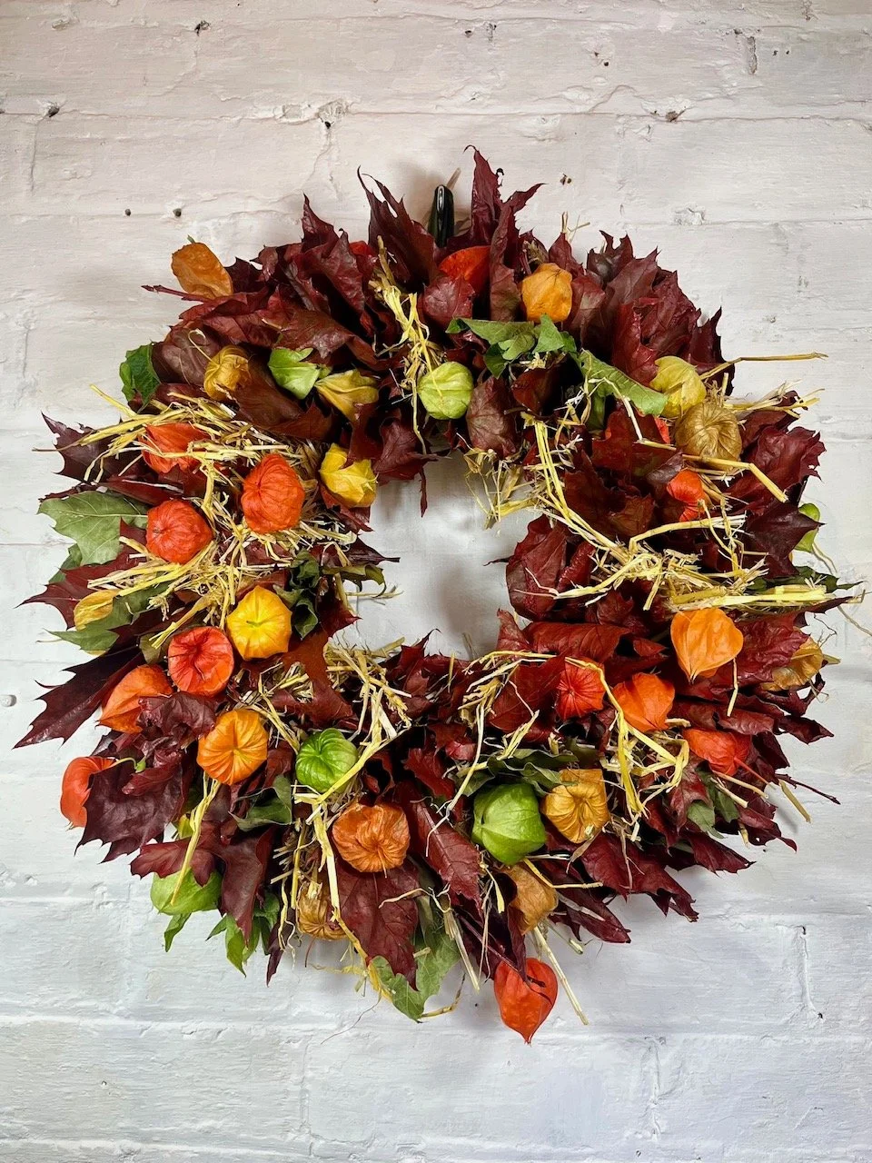 Hand bound onto a dried moss base, each one is slightly different but will feature red oak leaves, pretty physalis lanterns in shades of orange and brown and natural dried straw.