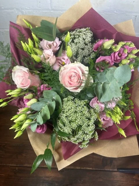A posy of large headed, pale pink roses framed with our signature wild-look foliage.